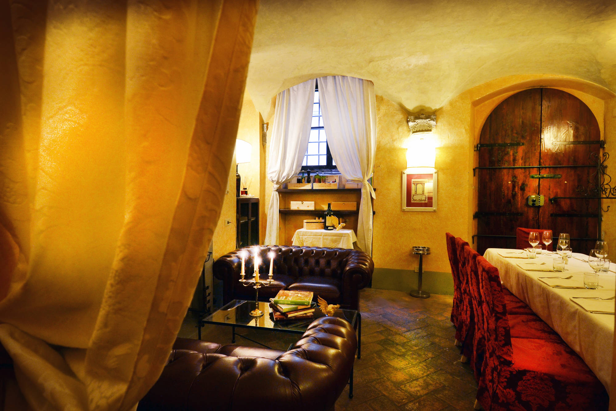 В ресторане вы окунетесь в атмосферу Средневековья: кирпичные стены и арочные своды, элегантная мебель и бархатные портьеры. Изюминка заведения — приватная гостиная с кожаными диванами и большим камином из тосканского песчаного камня.